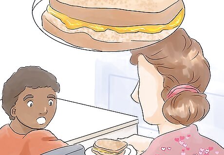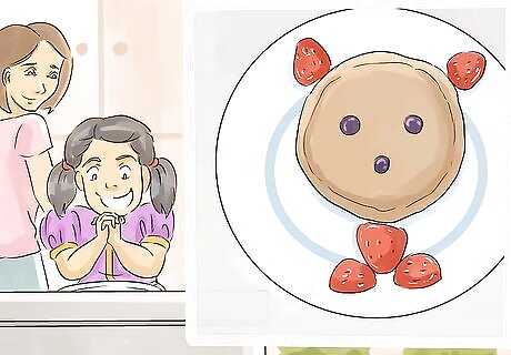 Try making a face with the food. Adding a touch of whimsy to your cooking is a great way to get kids interested in their meal. Some ways you can do this include: Using berries and whipped cream to make a face on a pancake. Creating a pizza face with pepperoni eyes, a black olive nose, and a sweet pepper strip mouth. Placing 2 meatballs on a plate of spaghetti for eyes and then using sauce to create a big smile.