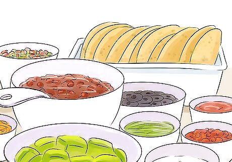 Create a do-it-yourself meal. Allowing the kids to assemble their food before or after you cook it can also be a great way to get them interested in eating it. Some options to try include: Having kids put toppings on their own mini pizzas before you put the pizzas in the oven. Letting kids choose the condiments, meat, cheese, and veggies that you put on their sandwich, or even letting them make the sandwich themselves with your help. Serving tacos with an array of different items they can add to them as they like, such as seasoned ground beef or vegetarian crumbles, shredded cheese, shredded lettuce, chopped tomatoes, sour cream, guacamole, and salsa.
