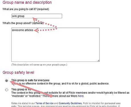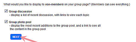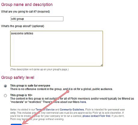 Name your group and select the Group Safety Level (whether it is age-restricted (18+) or not). Try to use a group name that would make sense to people searching for your interest or for the types of photos you'll be grouping in it. Press Next.