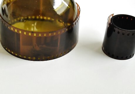 Place and assemble photo negatives in the order pleasing to you. Then glue them in place. If using for liquid, use Mod Podge to cover the photos and keep them waterproof.