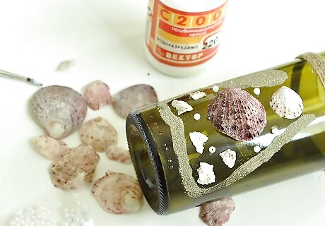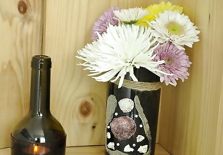 Decorate your newly cut wine bottle. Collect many creative, bright and sparkly craft and arts items for adding to the bottle.