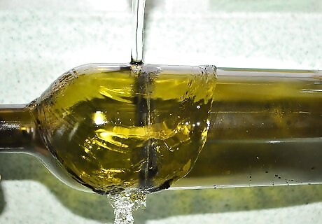Pour cold water or normal temperature water on the now heated line on the wine bottle. Repeat until you start to hear the bottle crack; bit by bit a cracking sound of glass will be heard.