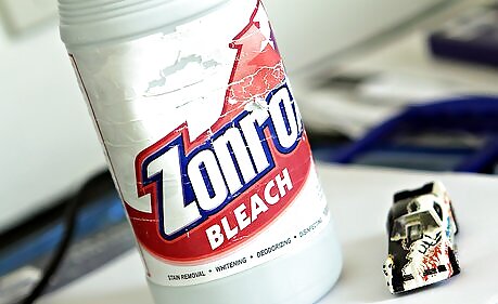 Pour enough bleach into the container to cover the parts. Usually about an inch or so will do the trick.