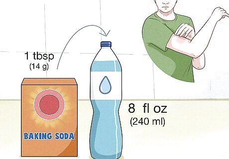 Use baking soda and water on your skin for something easy to mix on the go. Scoop 1 tablespoon (14 g) of baking soda into a 8 fl oz (240 ml) bottle of water and shake it thoroughly. Pour the mixture directly on your skin wherever you feel pain or irritation, but avoid using it in your eyes. If you have a stinging or burning feeling in your mouth, you can also swish the solution around before spitting it out. The chemicals in baking soda react with the RCAs and help soothe the burning sensation. Keep the baking soda and extra water bottles with you so you can help other people if they’ve been hit with RCAs.