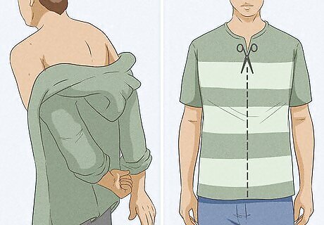 Take off any contaminated clothes. The particles from the RCAs will stick in the fibers of your clothing and can cause irritation when you come into contact with it. Take off all of the clothing that was exposed to RCAs as soon as possible. If you have to pull a piece of clothing over your head, cut it off with a pair of scissors instead so contaminants don’t get in your eyes, nose, or mouth. If you’re helping someone else remove their clothing, avoid touching any contaminated areas. For example, you can grab the inside of the shirt rather than the outside. If you can’t take off your clothes right away and you’re outside, spread your arms while you’re walking so the fresh air blows the irritants off.