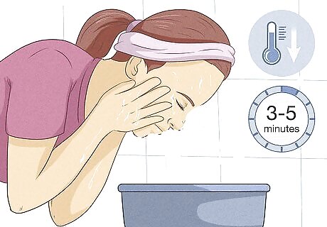 Flush the area with cold water or saline solution for the safest treatment. You can use bottled water, eye drops, or any other saline solution. If you have skin irritation, pour the water or saline directly on your skin to rinse it off. If you have RCAs in your eyes, slowly pour the water or saline solution onto your face while blinking rapidly. Keep rinsing your face for 3–5 minutes to help remove particles from the RCAs that cause irritation. If it got in your mouth, swish water in your mouth before spitting it out. Avoid using warm or hot water since it may reactivate the irritants from the RCAs. Lean down and tilt your head to the side so the RCAs don’t rinse down your face and cause more irritation. If you wear contacts, take them out right away and throw them away. If you have glasses, you can clean them with soap and water. You can buy saline solution from a local pharmacy, or you can make your own by adding 8 teaspoons (48 g) of salt to 1 gallon (3.8 L) of distilled water.Warning: Be careful not to rub or touch your eyes since your hands are probably contaminated, and it will cause more irritation.