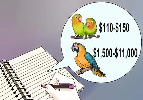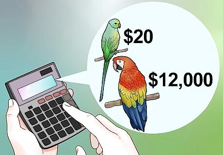 Create a budget. Visualizing startup and recurring costs will help you to decide if you're financially capable of providing the care and conditions that a parrot needs to thrive. For a small parrot, initial costs could be $110 to $150 with annual recurring costs of $300 to $500. Larger parrots could cost $1,500 to $11,000 initially and then $700 to $1,200 annually.