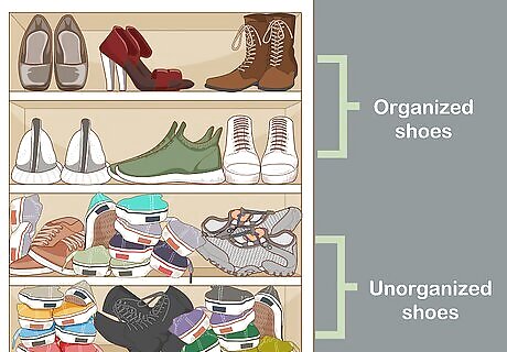 Install a shoe organizer. Having an out-of-the-way area to store footwear will come in handy when you just want to kick off your shoes after coming in from a long day. Whether you opt for a rack, cubby, mounted shelf or just a corner of the room where you can line up unworn shoes, you’ll be glad to have them all in one place that isn’t right in front of the door. If you live in an area that receives a lot of snow or rain, place a separate plastic tray nearby to leave wet boots and sneakers in. Use a mounted or hanging organizer to keep pairs of shoes together and out of the reach of pets.