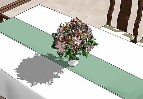 Put a vase of flowers in the center of the table to freshen up the space. If you are able to use fresh flowers, make sure to change them out once every couple of weeks. Fake flowers will not require as much upkeep. You can choose to have the vase be the focal point or use a variety of colors and shapes of flowers to create a unique arrangement. Simple greenery, like Baby’s Breath or succulents, also look great. If you have a long table, consider using 3 or 5 smaller vases of flowers and spreading them out in a line down the middle of the table.