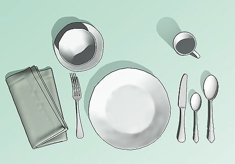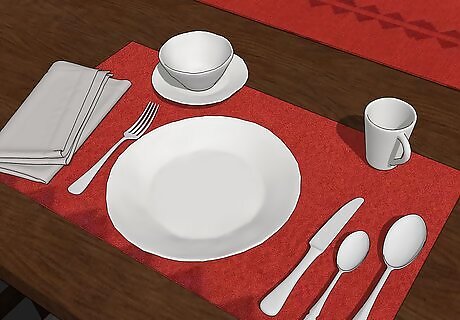 Choose plates and silverware that are appropriate for the occasion and theme. For a casual dinner, a dinner plate, salad bowl, water glass, fork, spoon, and knife may be enough. For more formal occasions, you may add a salad fork, bread bowl, dessert fork, and wine glasses. Pick out a common color between your table runner and placemats. Choose plate ware that also contains this color.