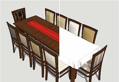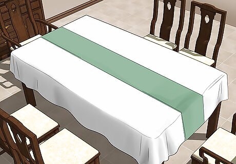Pick a table runner or tablecloth from a local home good store. The runner or cloth you choose can help bring a mood to the room, so consider keeping it simple or, if you want to purchase several, change them out depending on the season. Match cloth napkins to the tablecloth or runner for special events. For a formal dinner or other special occasion, a table runner with hints of gold or silver helps create an elegant look. If you appreciate a modern style, a simple white or other neutral color runner will accentuate a minimalist feel. You can also match the tablecloth to the season. For summer, choose bright hues of blue, green, and yellow. For fall, go for warm colors like reds and oranges.