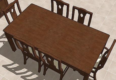 Leave your table mostly bare. Do not put plates or silverware on the table. Make sure there is enough space on the table for you to use for cooking, writing, reading, and other daily activities. By allowing your dining table to be mostly free of decorations and clutter, you can use the space for more than just eating! You can use wax or another product with a glossy finish to keep your table gleaming and looking great.