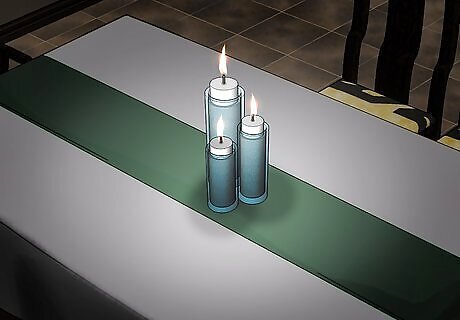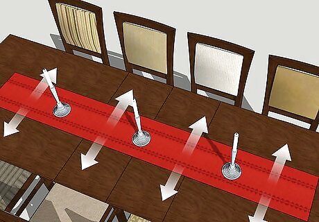 Choose a centerpiece that fits your table’s space. Aim to having the tallest and largest part of the centerpiece in the center of the table and other smaller pieces out toward the sides. When using multiple candles or flower vases, use odd numbers because they are more pleasing to the eye. Make sure the centerpiece won’t obstruct the guests’ views. Place the centerpiece and sit down in one of the chairs to test if it blocks your view of the other side of the table. For a formal occasion, tall candles create a romantic mood. Place them in the spaces on the table runner where guests aren’t looking across the table. If you are using a circular table, cluster items of different sizes and heights in the center of the table to add variety. For a more eclectic look, place tea-light candles in between the other items.