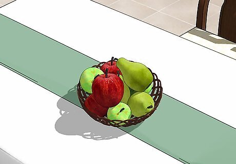 Place a bowl or basket in the center to hold decorative items. Pick a material and size of basket or bowl that compliments the size and texture of the table. The bigger the table, the bigger the bowl! Put fruit in a wooden bowl for a pop of color and for healthy snacks on the run. An inexpensive alternative is to fill the bowl with scented pinecones, stones, or potpourri.