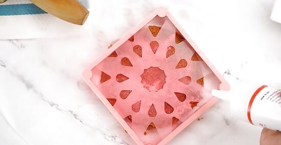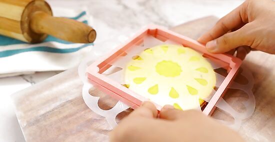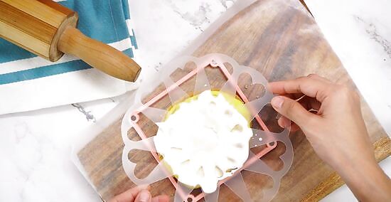 Lift the stencil up quickly and carefully to remove it. Grasp the edges of the stencil and lift it straight up to avoid smudging the icing. Keep a finger or two on the cookie to keep it from moving when you remove the stencil quickly. Lifting the stencil off at an angle is bad because it could smear your icing.