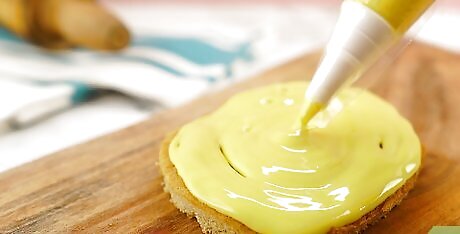 Use magnets or a stencil frame to hold the stencil in place over the cookie. Purchase a stencil frame that uses magnets to hold the frame in place so your hands are free. If you don’t want to purchase a stencil frame, stack a couple small, round magnets on top of one another and place them around the cookie, putting the stencil in between them to keep it taut and in place. Stencil frames can be found online and are adjustable to fit any size cookie. For example, place 4 round magnets around the cookie, put the stencil on top of the magnets, and then add another layer of magnets on top of the 4 magnets to keep the stencil in place.