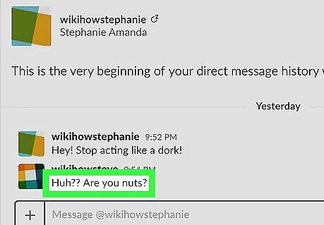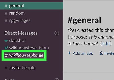 Click a direct message on the left panel. All of your direct message threads are listed under the Direct Messages heading on the left navigation panel. Clicking will open the conversation on the right-hand side of your window. You can also delete an entire direct message conversation by clicking the "x" icon next to the message here, but it will not delete your chat history.