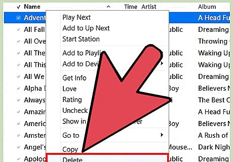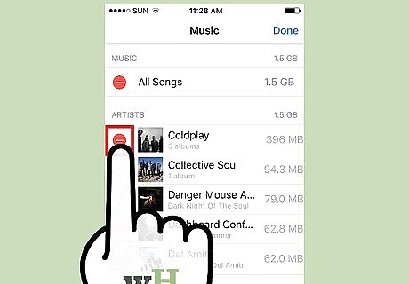 Delete individual songs, albums, or artists. You can delete single songs, whole albums, or everything by a specific artist. To delete all of the songs from an artist, tap the "Edit" button, tap the red "-" next to the artist's name, and then tap the "Delete" button that appears. If you want to delete an album or an individual song, turn Edit mode off so you can navigate through your music. Tap an artist to see all of the albums from that artist you have on your device, and then tap an album to see all of the songs. When you've found something you want to delete, tap the "Edit" button, tap the red "-", and then tap the "Delete" button.
