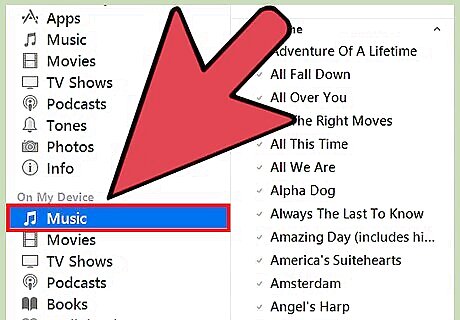 Select "Music" from the "On My Device" menu. This will list all of the music currently stored on the iPod.