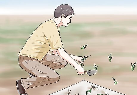 Remove unwanted plants. Crabgrass and other non-native plant growth should be eliminated before beginning your desert garden. Uproot plants and larger shrubs and discard them in garden waste bags. After mowing your grass short, layer newspaper and cardboard on top of it. Wet the layers, then cover them with compost. Once the grass is dead, rototill the area.