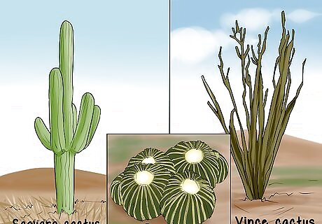 Incorporate native plants into your garden. Desert plants like Palo Verde trees, mesquite, chuparosa, and desert lavender thrive in a desert garden. Various species of cactus – including the saguaro cactus, barrel cactus, and vine cactus – are also appropriate in a southwestern U.S. desert garden. These plants will do well because they require little to no water, a resource which is in short supply in the desert. Do not incorporate plants that don’t thrive in the desert into your desert garden. You can obtain plants for your desert garden from home and garden supply stores.
