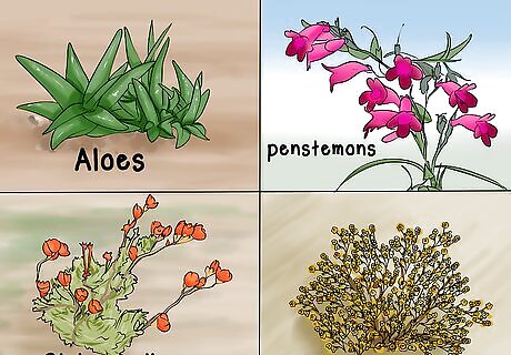 Encourage biodiversity. A diverse family of plants fosters resilience within your garden’s plant community. Don’t limit yourself to just a few species of grasses or cacti. Instead, include a variety of plants in your desert garden. Other plants you could include in your desert garden include: Aloes Globe mallows Brittle bushes Penstemons Poverty bushes