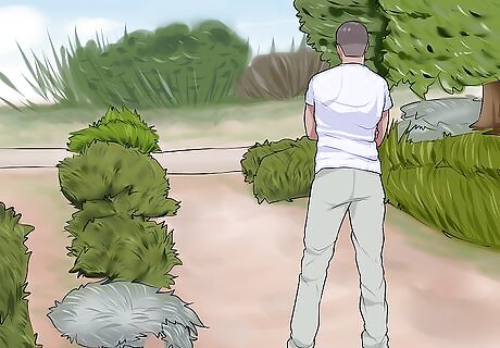 Visualize your garden. Before you get started, you should be able to walk through the space that will become your garden and imagine what goes where. Imagine, for instance, where your wash will be, where your trees will be, and where your cacti will be. It might help if you walk through the space with a friend or family member and explain the future desert garden to them. This will help solidify the plan in your mind and allow you to confront issues that you might not have thought of, but that your friend or partner might raise. You could also sketch a 2-D layout or map of the future garden to help you get a better grip on what your desert garden will look like. Include all the major elements of your desert garden on the map. When visualizing your garden, you should imagine how large the final, mature plants will be. Plan your desert garden accordingly, with enough space for trees to grow to their full height.