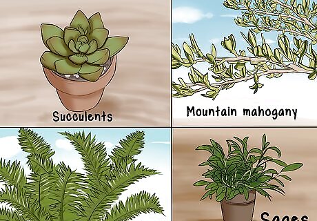 Choose shrubs. Shrubs are some of the most common and resilient of desert plants. Shrubs provide beautifying color for the garden, and cover for smaller plants that can thrive in their shade. Apache plumes, fern bushes, sages, succulents, and curl-leaf mountain mahogany are some of the most popular desert shrubs.