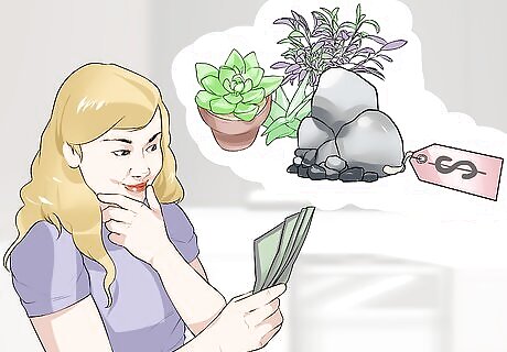 Come up with a budget. Once you know what you want in your desert garden, you should investigate the price of the plants, rocks, and other elements you want. Depending on your financial resources, you might need to revisit your initial plans in order to determine if you need to scale back your vision for the garden. The amount of money you should budget toward your desert garden depends on your own income level and commitment to the project.