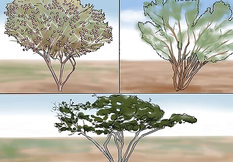 Select some trees. Trees can serve as a visual anchor for your desert garden. Of all desert flora, trees have the largest requirements for water, so you should plant your desert trees close to the wash. Monitor your trees closely and look for signs that they are withering (for instance, dry leaves and loss of leaf cover). Water your trees if they show signs of drying out. Some trees that grow successfully in the desert include: guajillo white thorn acacia leather-leaf acacia sweet acacia palo blanco anacacho orchid Mexican blue palm
