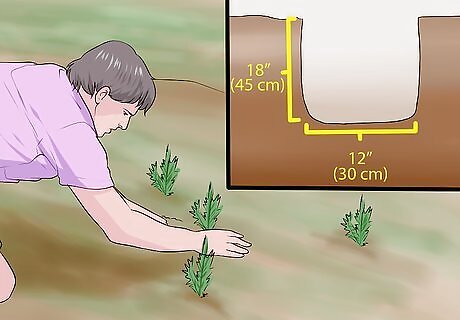 Install your plants. Dig a series of holes in your yard to accommodate the incoming plants and bushes. For most plants, a hole 12 inches (30 cm) wide and 18 inches (46 cm) deep is sufficient. Once you’ve dug the holes, place your plants into the holes, then fill the soil you’ve removed back into the hole to keep the plants anchored in place. It will probably take several weeks to obtain and install all your plants. Each plant grows best under particular ecological conditions. For instance, baby penstemons, brittlebush, and globe mallow thrive when planted near the edges of the wash and in other areas of disturbed soil. Space your plants out appropriately. Consult a guide of desert botany to determine the best location and provide adequate space for each plant species you incorporate into your desert garden.