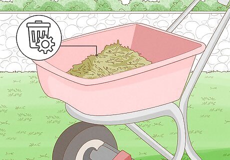 Remove the debris created by a vertical mower or core aerator with a leaf rake, and load it into a wheelbarrow for disposal.