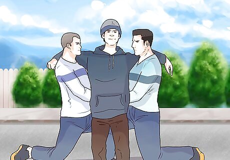 Wrap the person’s arms around each of your shoulders and grab their waist. Once you have the person standing, guide their arm around the back of your neck and over your shoulder. Wrap your other arm around their waist. Have your partner do the same thing on the other side. As you do this, bend your knees and crouch down slightly, then straighten up into a standing position. If the person is unconscious, put their arm around your shoulders and grab their waist before pulling them up into a standing position.