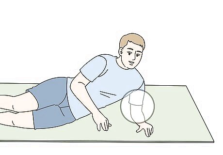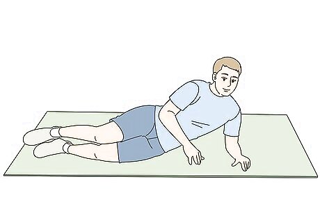 Support your upper body with your left elbow. Look in a mirror or ask a friend to check your position. Ensure that your left elbow is directly under your shoulder, not under your neck or chest. Place your right hand behind your head if you want to challenge yourself a little more. You can also rest your right hand on the ground in front of you if you need more stability. If supporting your upper body with your elbow feels uncomfortable, lie all the way down on your side with your arm outstretched above your head and your palm on the floor. Rest your head on your bicep and relax your neck. Put your right hand on the floor in front of your chest for extra stability.