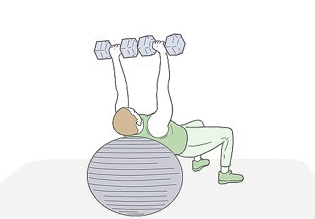 Perform flys on an exercise ball to work your back and core. Doing dumbbell flys on a bench works your chest muscles and biceps, but doesn’t do much for your back or core. To work these muscles at the same time, sit back on an exercise ball instead of a bench. Spread your feet out further to maintain your balance and do your flys as you normally would.Warning: This can be quite dangerous if you’re working with weights that are too heavy for you. Make sure that you start off with lighter weights, even if you’re confident that you can handle bigger dumbbells.