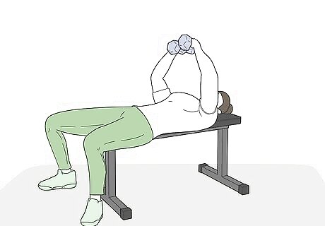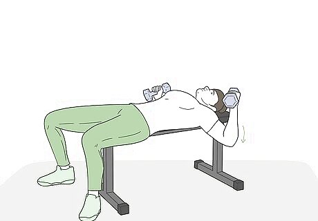 Lay down while pulling the dumbbells up to your chest. Slowly lay down on your bench while pulling your legs up into the air to hoist the dumbbells up to your chest. Once you’re on your back and the dumbbells are in the air, return your feet to the floor and straighten your back. if you’re working with lighter weights, you may not need to rock on your back with your legs hoisted in the air.