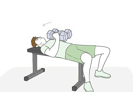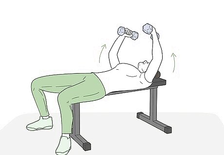Tighten your chest muscles and inhale. Dumbbell flys are designed to work your chest muscles, not your arms. Flex your pectoral muscles to activate them and take a deep breath. Bend your elbows a little bit so that your chest muscles are keeping the weights in place and they aren’t relying on your locked elbows. This exercise may make your biceps a little sore, but you shouldn’t feel anything in your elbows. If you’re elbows hurt while doing this, they are too bent. If you don’t feel any tightness in your chest muscles, they aren’t bent enough.