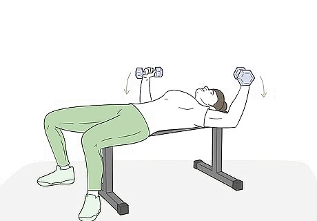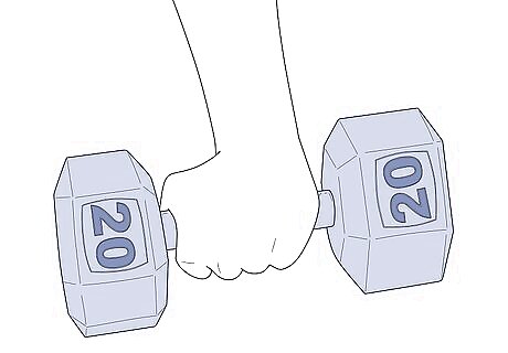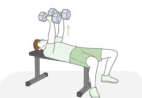 Get a pair of 5–20 lb (2.3–9.1 kg) dumbbells based on your weight and experience. Dumbbell flys can put a lot of strain on your arm muscles, so start with a lighter set of dumbbells if you haven’t been actively lifting weights for very long. A set of 5–10 lb (2.3–4.5 kg) dumbbells are a great starting point, and you can always increase the weight after you’ve mastered the form.Tip: If you’re over 180 lb (82 kg) and actively weight train with some regularity, you can start off with a set of 15–20 lb (6.8–9.1 kg) dumbbells. You don’t want to hurt yourself. If you aren’t sure what weight of dumbbells you can handle, start with 5 lb (2.3 kg) weights and work up from there.