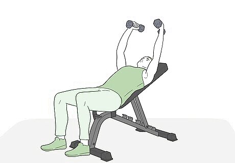 Do your flys on an incline bench to target the top of your pectoral muscles. For a variation of the dumbbell fly that targets your upper chest and shoulder muscles, grab the same set of dumbbells that you use for the standard flys on the bench. Lay on an incline bench at a 30-degree angle. Perform your flys the same way that you do on a flat bench, raising and lowering your arms straight up in the air as if you were on a flat surface. Be especially careful to avoid over-stretching while doing this, since your elbows and arms are going to resist lowering straight down at your sides when you’re laying at an incline.