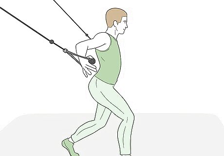 Complete standing cable flys with one foot forward to work your entire body. Use a cable machine and start with 10–30 lb (4.5–13.6 kg) of resistance on each side. Grip both cables with your arms directly at your side and put one foot in front of the other. Pull the cables forward with your elbows bent, stopping after you bring your arms 2–3 feet (0.61–0.91 m) in front of your chest. Do 5-10 reps and then switch your feet and put your back foot in front. The standing cable fly will strengthen your back muscles, arms, chest and core. Depending on the height of the machine, you may need to pull your arms at a downward angle. This is fine. Keep your back straight as you’re doing this.