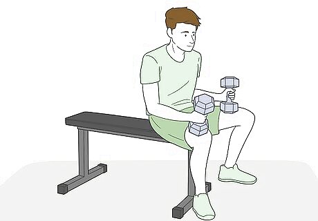 Sit down on a lifting bench and rest the dumbbells on your thighs. Let the dumbbells hang down to at your sides and stand at the edge of your lifting bench. As you start sitting down, move the dumbbells in front of you so that they’re resting on your thighs by the time you’re fully seated. This will keep you from straining your arms prior to the actual workout. If it’s uncomfortable to rest the weights on your thighs, you can rest them on the bench itself, in between your legs. Be careful when you’re pulling them up though so that you don’t injure your groin or hit your stomach.