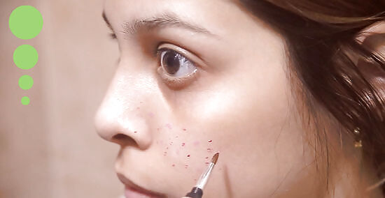 Tap on your glitter. Use the tip of your index finger to gently dab on your glitter. Try to dab glitter over your existing freckles, making them sparkle slightly. You can also dab glitter in between the freckles, creating an attractive, shimmery look on your face. There is no precise to apply glitter. Apply as much glitter as you want and in a manner that looks attractive to you. Remember to use a shade of glitter that matches well with your lipstick.