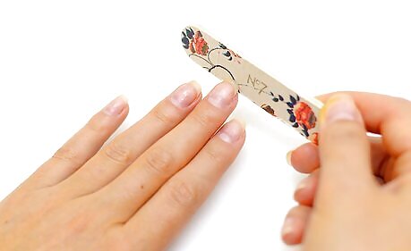 Cut and shape your nails. It's important to have all your nails relatively the same shape and size. You can have either square, oval, rounded, stiletto, almond, or even lipstick shaped nails. Try going off of your current nail shape or whatever works best for your everyday routine. For example, if you are constantly typing, you may want to avoid a long, stiletto nail as it can make using a keyboard difficult. Once you cut the nail down with clippers or nail scissors, use a nail file to shape and smooth the edges. Slide the file in one direction across the top of your nail. Moving the file back and forth in a sawing motion could damage your nail. Keep the length close to your regular length as well. Working with longer nails can be difficult to adjust to if you don't usually have them.