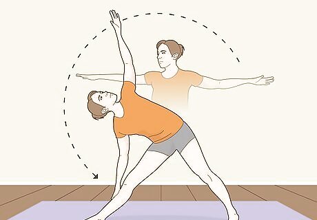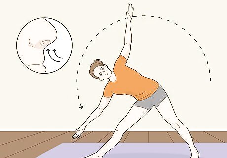 Inhale and reach your body to the right as you exhale. As you exhale, stretch your right arm as far as it will go to the right. Stop when you’ve reached as far as you can and hold your torso in place. Rotate your arms so that your left arm reaches up and your right arm reaches down. Ideally, the line of your arms forms a roughly 90-degree angle with the floor. As you reach, keep your body facing forward. Square your hips and shoulders toward the front of the mat. Keep your waist as straight as possible while you bend, and keep your arms in a straight line.