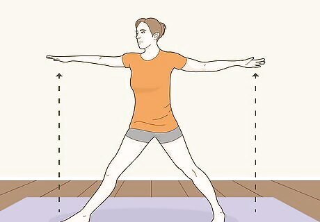 Hold your arms parallel to the floor. Raise your arms outward on either side. Form a line with your arms, going from the fingertips on one arm to the fingertips on the other arm, that runs roughly parallel to the floor. Stretch your fingertips out to each side. Make sure your palms are facing the floor and your shoulder blades are pinned back to your spine. To check the alignment, flip your palms over and take note of any shift in your scapula or shoulders, then turn your palms back over.