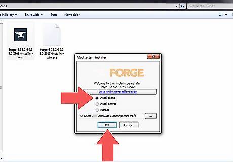 Select "Install Client" and click Next. Make sure the radial button next to "Install Client" is selected and click Next. This installs Minecraft Forge. Once the installation is finished, you will see a message informing you that it was successful.