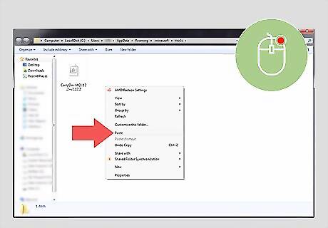 Paste the mod in the Mods folder. To paste, right-click and click Paste in the menu that appears. This installs the mods on Minecraft. Some mods, such as the realistic shaders mod require additional mods and APIs to be installed. Read any additional instructions that are on the information pages for the mods you download.