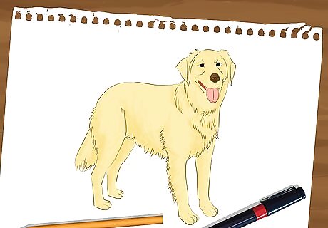 Color in your drawing. Use bright colors, like the golden yellow seen here. Make your Retriever's coat lightest on its stomach, darkest on its back, and remember to give its tongue a lively pink coloring!