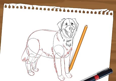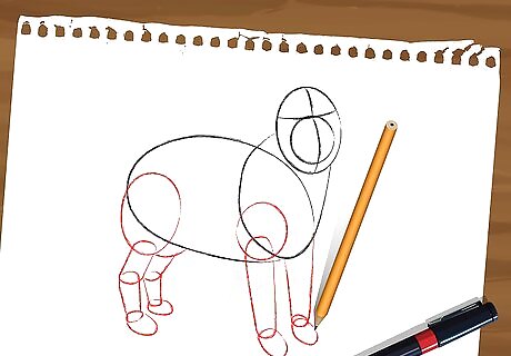 Add in the legs. Each one is different, so be careful about your technique-- Draw a circle over the body and neck shapes (only for the right-visible-leg). Draw down from the circle a long tubular shape (the left leg should be drawn straight from the dog's body). Finish each front leg with a small oval for the paw. For the back legs draw a big oval over the body and another one showing only under the body. Sketch a vertical tubular shape down from each of these ovals. Finish each back leg with a small oval for the paw.
