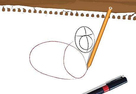 Make the neck and the body. Draw two lines coming down from the head. Connect these lines with a semicircle, which will serve as the neck. Add a large oval at his left side, connected to the neck by an overlap with the semicircle.